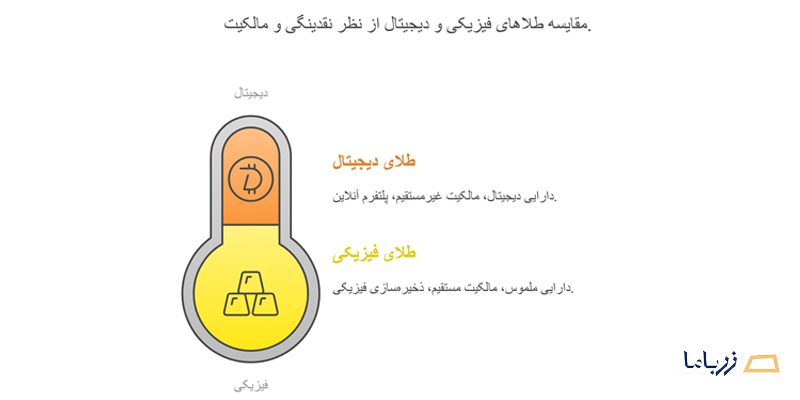 طلای دیجیتال: مالکیت طلا در این نوع دیجیتال به صورت دیجیتالی و از طریق پلتفرمهای آنلاین مدیریت میشود. شما بهطور غیرمستقیم مالک طلا هستید، اما در واقعیت آن را در دست ندارید و فقط در قالب رمزنگاری شده به آن دسترسی دارید.