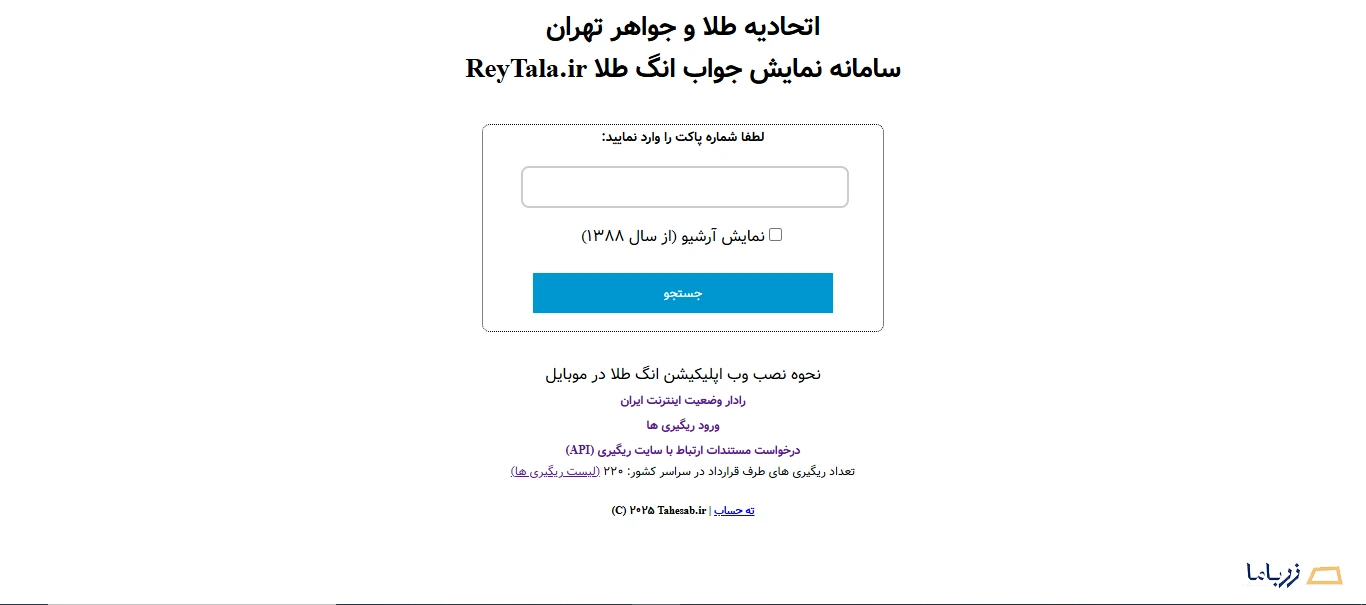 در صفحه اصلی سایت، کادری برای وارد کردن انگ طلا تعبیه شده است. در زیر این کادر، گزینهای با عنوان “نمایش آرشیو از سال 1388” قرار دارد. با فعال کردن این گزینه، میتوانید به آرشیو کامل کدهای انگ از سال 1388 تا کنون دسترسی داشته باشید. لازم به ذکر است که اگر آزمایش ریگیری طلای آبشده پیش از این تاریخ انجام شده باشد، نتیجهای برای جستجو نمایش داده نمیشود، زیرا اطلاعات مربوطه در سامانه ثبت نشده است.