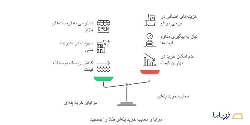 اما ریسک خرید در زمان‌هایی که قیمت طلا بالا است، افزایش می‌یابد. از سوی دیگر خرید پله‌ای به شما این امکان را می‌دهد که به‌طور تدریجی و منظم طلا خریداری کنید و با میانگین‌سازی قیمت‌ها ریسک نوسانات بازار را کاهش دهید.