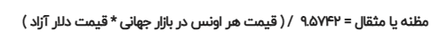 برای محاسبه مظنه طلا، به قیمت جهانی طلا(اونس طلا) و نرخ ارز نیاز داریم. فرمول محاسبه مظنه طلا به شرح زیر است: